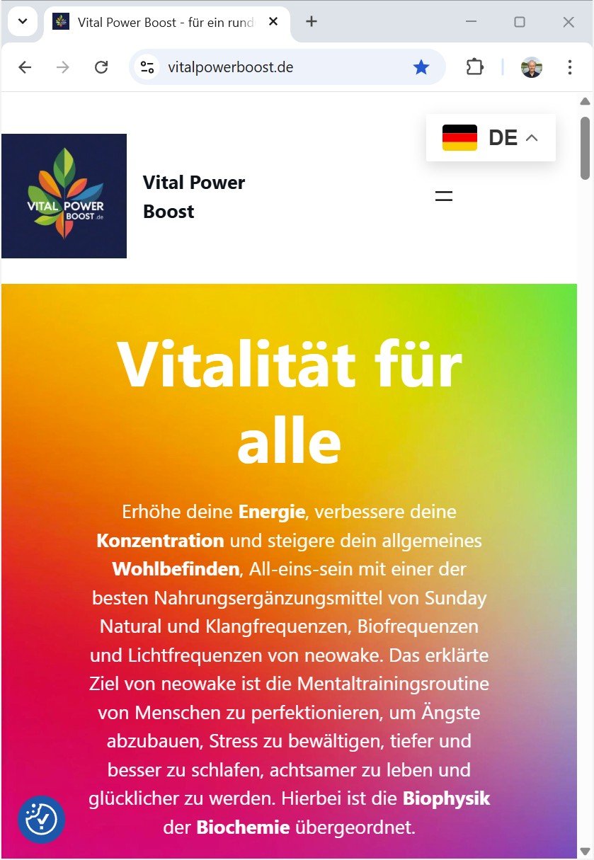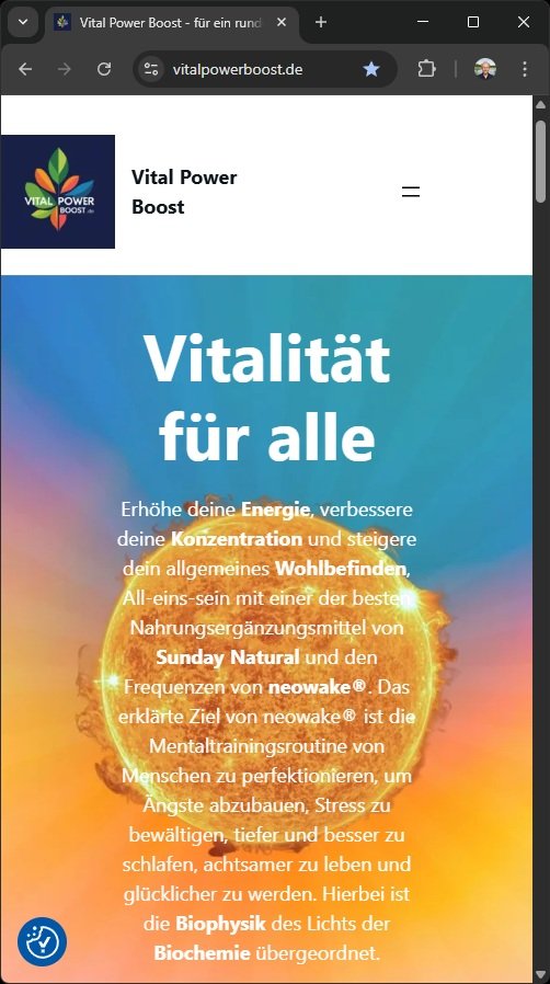 Sie starten Ihren Webbrowser, z.B. Google Chrome oder Mozilla Firefox. Der Browser ist der Client zum Aufrufen, Betrachten und Verarbeiten von Webseiten. Sie geben die Adresse der anzuzeigenden Website in die Adresszeile des Browsers ein. Die Adresse im Beispiel ist vitalpowerboost.de, der Betreiber des Internet-Manuals. Der eigentlichen Adresse des Hosts wird http:// oder https:// vorangestellt, damit der Browser erkennt, um welches Übertragungsprotokoll es sich handelt. Die meisten Browser sind aber so tolerant, dass sie automatisch das Übertragungsprotokoll ergänzen, wenn Sie kein Protokoll angeben. Auf der Seite Aufbau der Web-Adresse wird die komplette Syntax der einzugebenen Adresse erklärt.